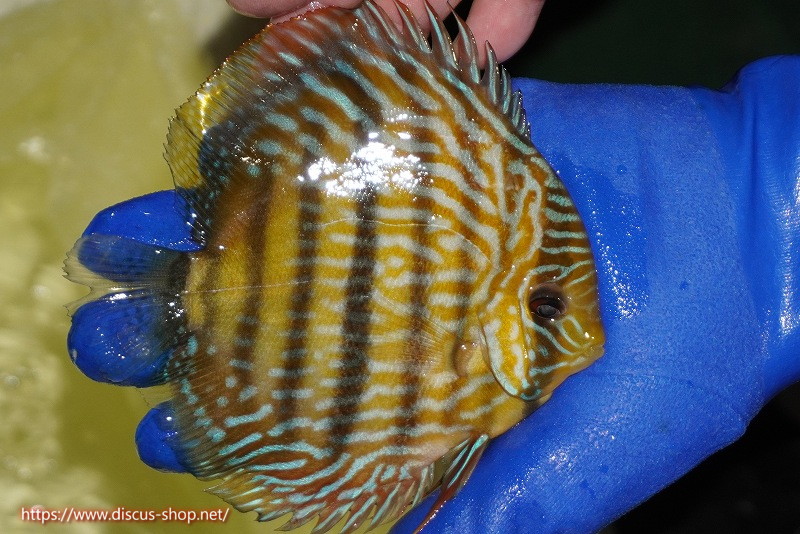 イエローベースが美しいソリッド、ソリッドセンターバー、ロイヤルブルーが混生するウラリアチャンネルに絡む有名産地。 きめ細かな鱗からの上品な発色、ロイヤル個体の明瞭なラインパターン、千差万別の個体差はワイルドディスカスの魅力を存分に持ち合わせた個体といえます。