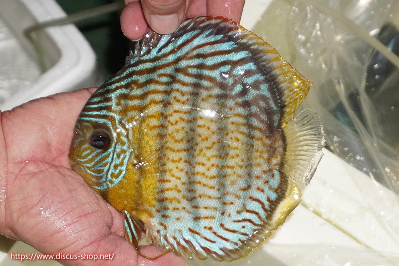 グリーンディスカスの中でも最もバリエーションが豊富でラージスポットタイプ、スポットラインタイプをはじめ、ロイヤルラインタイプなどの極上個体。またベースカラーの黄色、ホリゾンタルラインの青み、スポットの赤と最もカラフルな種となります。仕上がれば改良品種顔負けのど派手なパターンを持つ魅力的な産地の個体となります。