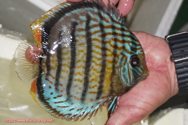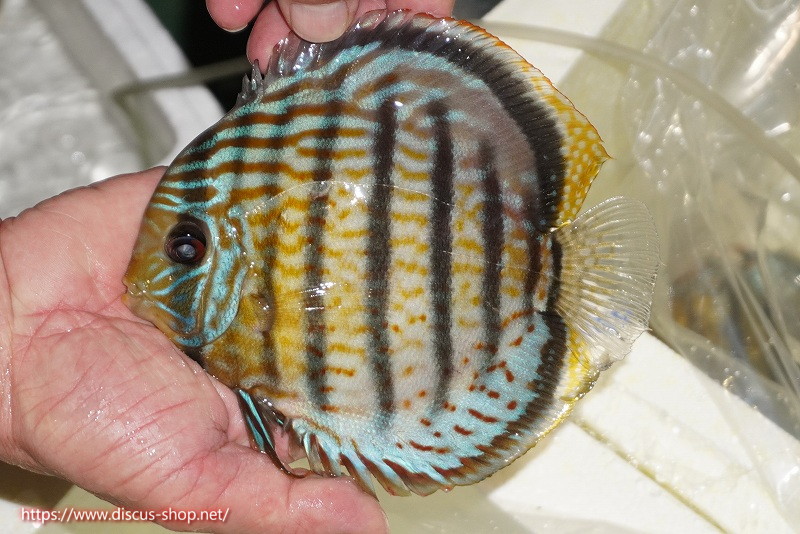 グリーンディスカスの中でも最もバリエーションが豊富でラージスポットタイプ、スポットラインタイプをはじめ、ロイヤルラインタイプなどの極上個体。またベースカラーの黄色、ホリゾンタルラインの青み、スポットの赤と最もカラフルな種となります。仕上がれば改良品種顔負けのど派手なパターンを持つ魅力的な産地の個体となります。