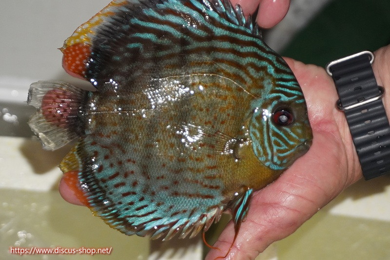 グリーンディスカスの中でも最もバリエーションが豊富でラージスポットタイプ、スポットラインタイプをはじめ、ロイヤルラインタイプなどの極上個体。またベースカラーの黄色、ホリゾンタルラインの青み、スポットの赤と最もカラフルな種となります。仕上がれば改良品種顔負けのど派手なパターンを持つ魅力的な産地の個体となります。