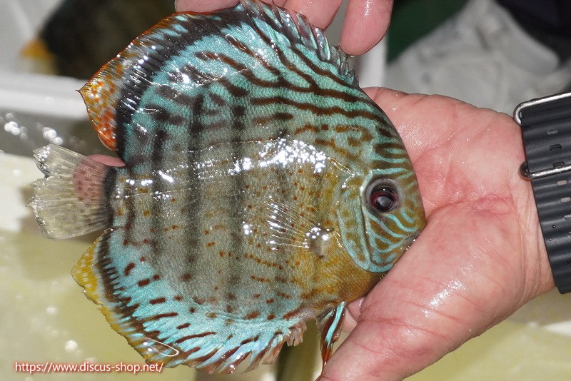 グリーンディスカスの中でも最もバリエーションが豊富でラージスポットタイプ、スポットラインタイプをはじめ、ロイヤルラインタイプなどの極上個体。またベースカラーの黄色、ホリゾンタルラインの青み、スポットの赤と最もカラフルな種となります。仕上がれば改良品種顔負けのど派手なパターンを持つ魅力的な産地の個体となります。