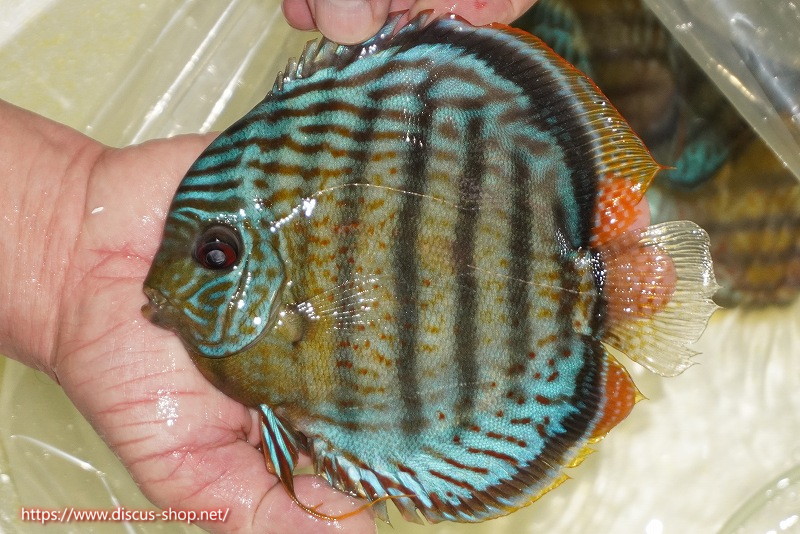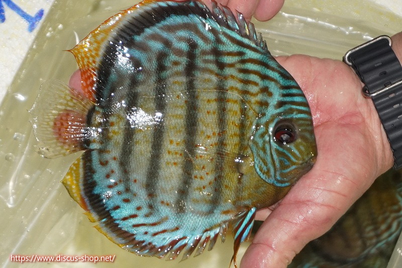 グリーンディスカスの中でも最もバリエーションが豊富でラージスポットタイプ、スポットラインタイプをはじめ、ロイヤルラインタイプなどの極上個体。またベースカラーの黄色、ホリゾンタルラインの青み、スポットの赤と最もカラフルな種となります。仕上がれば改良品種顔負けのど派手なパターンを持つ魅力的な産地の個体となります。