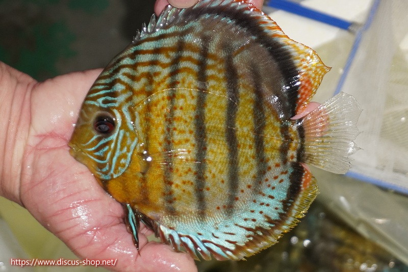 グリーンディスカスの中でも最もバリエーションが豊富でラージスポットタイプ、スポットラインタイプをはじめ、ロイヤルラインタイプなどの極上個体。またベースカラーの黄色、ホリゾンタルラインの青み、スポットの赤と最もカラフルな種となります。仕上がれば改良品種顔負けのど派手なパターンを持つ魅力的な産地の個体となります。
