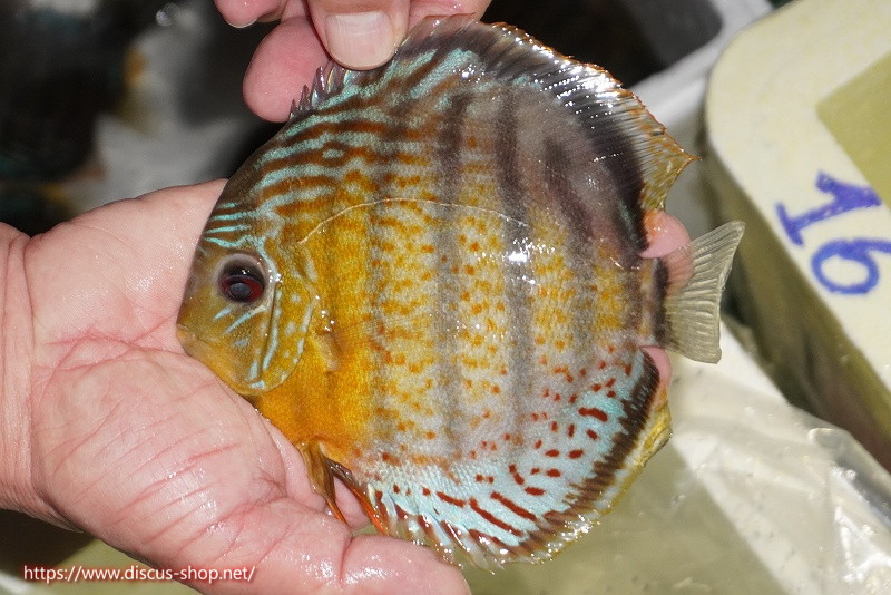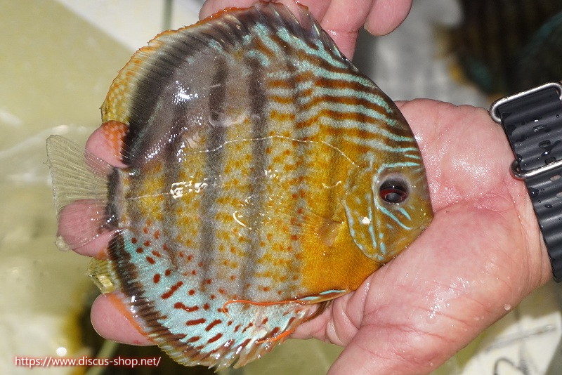 グリーンディスカスの中でも最もバリエーションが豊富でラージスポットタイプ、スポットラインタイプをはじめ、ロイヤルラインタイプなどの極上個体。またベースカラーの黄色、ホリゾンタルラインの青み、スポットの赤と最もカラフルな種となります。仕上がれば改良品種顔負けのど派手なパターンを持つ魅力的な産地の個体となります。