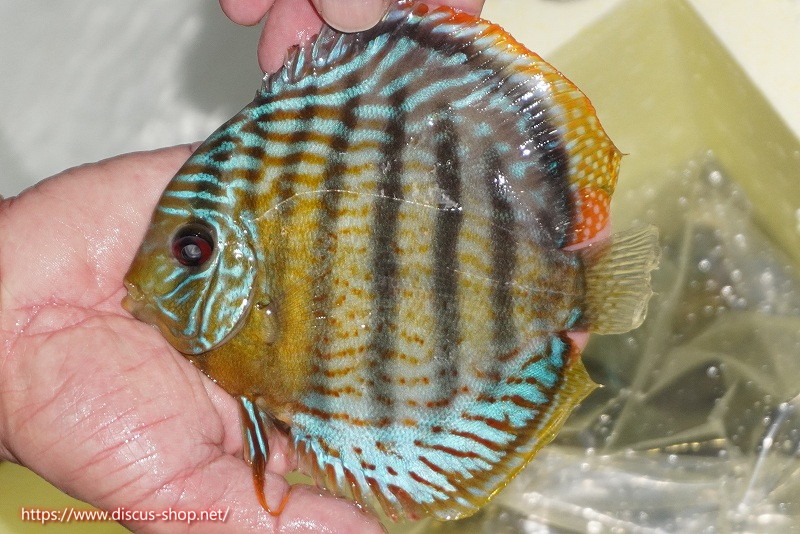 グリーンディスカスの中でも最もバリエーションが豊富でラージスポットタイプ、スポットラインタイプをはじめ、ロイヤルラインタイプなどの極上個体。またベースカラーの黄色、ホリゾンタルラインの青み、スポットの赤と最もカラフルな種となります。仕上がれば改良品種顔負けのど派手なパターンを持つ魅力的な産地の個体となります。