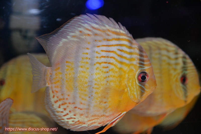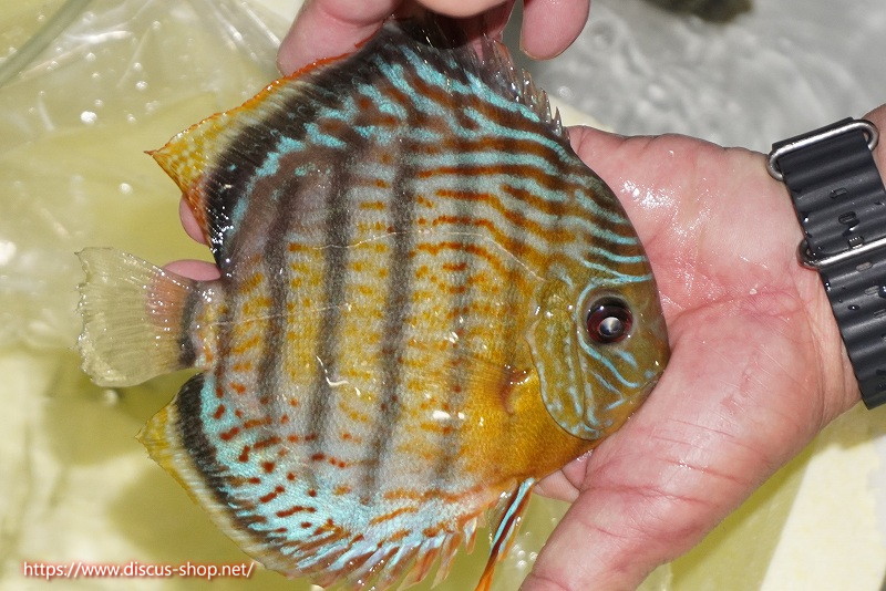 グリーンディスカスの中でも最もバリエーションが豊富でラージスポットタイプ、スポットラインタイプをはじめ、ロイヤルラインタイプなどの極上個体。またベースカラーの黄色、ホリゾンタルラインの青み、スポットの赤と最もカラフルな種となります。仕上がれば改良品種顔負けのど派手なパターンを持つ魅力的な産地の個体となります。
