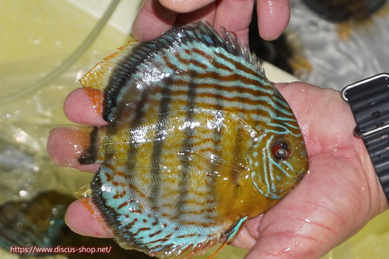 グリーンディスカスの中でも最もバリエーションが豊富でラージスポットタイプ、スポットラインタイプをはじめ、ロイヤルラインタイプなどの極上個体。またベースカラーの黄色、ホリゾンタルラインの青み、スポットの赤と最もカラフルな種となります。仕上がれば改良品種顔負けのど派手なパターンを持つ魅力的な産地の個体となります。