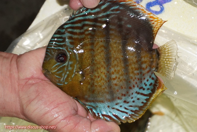 グリーンディスカスの中でも最もバリエーションが豊富でラージスポットタイプ、スポットラインタイプをはじめ、ロイヤルラインタイプなどの極上個体。またベースカラーの黄色、ホリゾンタルラインの青み、スポットの赤と最もカラフルな種となります。仕上がれば改良品種顔負けのど派手なパターンを持つ魅力的な産地の個体となります。