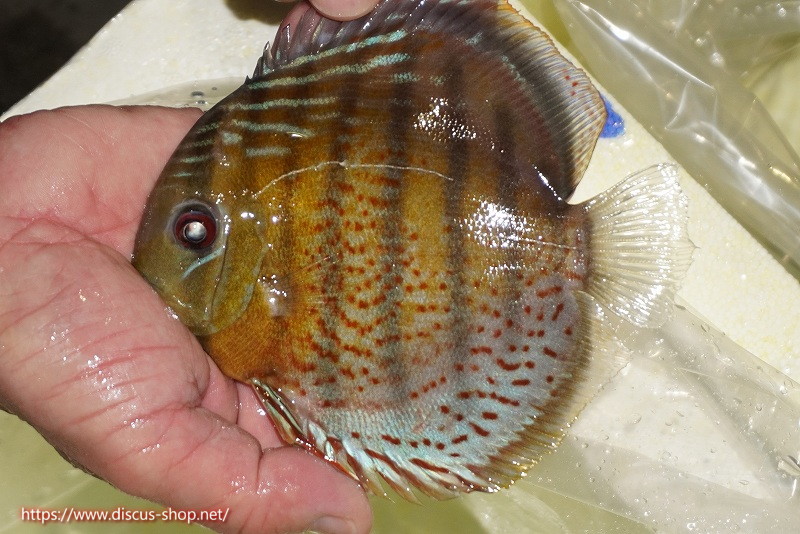グリーンディスカスの中でも最もバリエーションが豊富でラージスポットタイプ、スポットラインタイプをはじめ、ロイヤルラインタイプなどの極上個体。またベースカラーの黄色、ホリゾンタルラインの青み、スポットの赤と最もカラフルな種となります。仕上がれば改良品種顔負けのど派手なパターンを持つ魅力的な産地の個体となります。