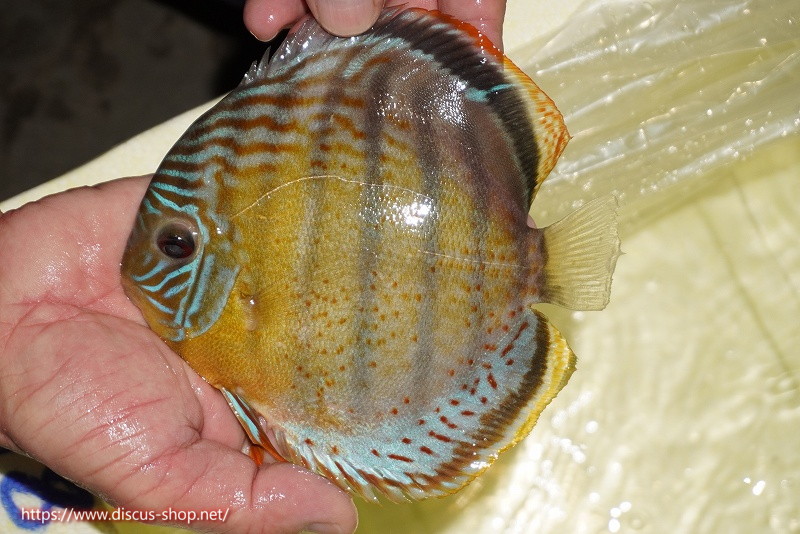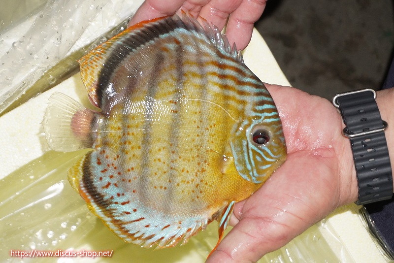 グリーンディスカスの中でも最もバリエーションが豊富でラージスポットタイプ、スポットラインタイプをはじめ、ロイヤルラインタイプなどの極上個体。またベースカラーの黄色、ホリゾンタルラインの青み、スポットの赤と最もカラフルな種となります。仕上がれば改良品種顔負けのど派手なパターンを持つ魅力的な産地の個体となります。