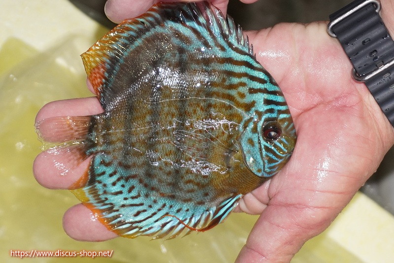 グリーンディスカスの中でも最もバリエーションが豊富でラージスポットタイプ、スポットラインタイプをはじめ、ロイヤルラインタイプなどの極上個体。またベースカラーの黄色、ホリゾンタルラインの青み、スポットの赤と最もカラフルな種となります。仕上がれば改良品種顔負けのど派手なパターンを持つ魅力的な産地の個体となります。