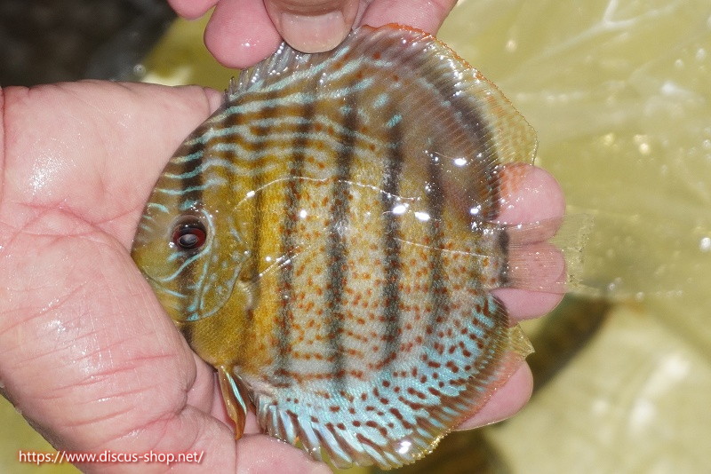 グリーンディスカスの中でも最もバリエーションが豊富でラージスポットタイプ、スポットラインタイプをはじめ、ロイヤルラインタイプなどの極上個体。またベースカラーの黄色、ホリゾンタルラインの青み、スポットの赤と最もカラフルな種となります。仕上がれば改良品種顔負けのど派手なパターンを持つ魅力的な産地の個体となります。