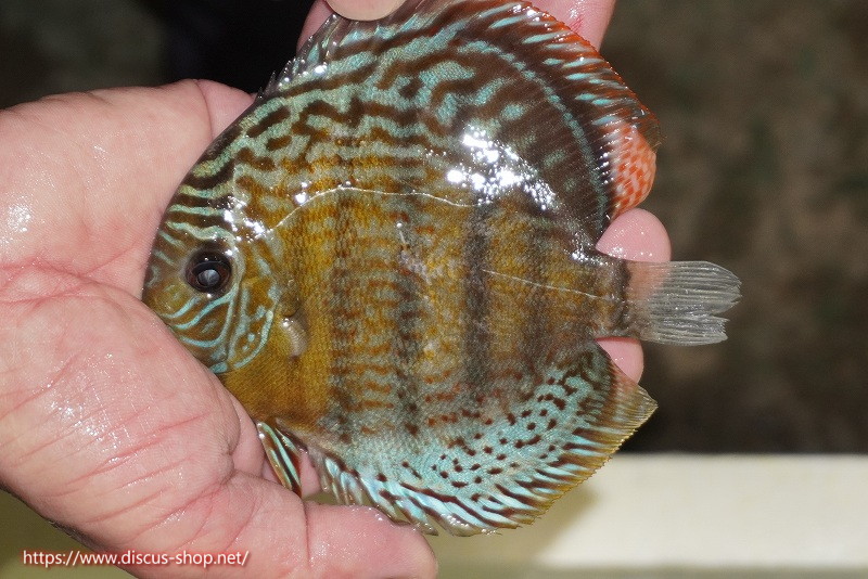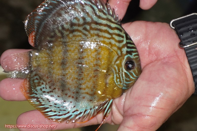 グリーンディスカスの中でも最もバリエーションが豊富でラージスポットタイプ、スポットラインタイプをはじめ、ロイヤルラインタイプなどの極上個体。またベースカラーの黄色、ホリゾンタルラインの青み、スポットの赤と最もカラフルな種となります。仕上がれば改良品種顔負けのど派手なパターンを持つ魅力的な産地の個体となります。