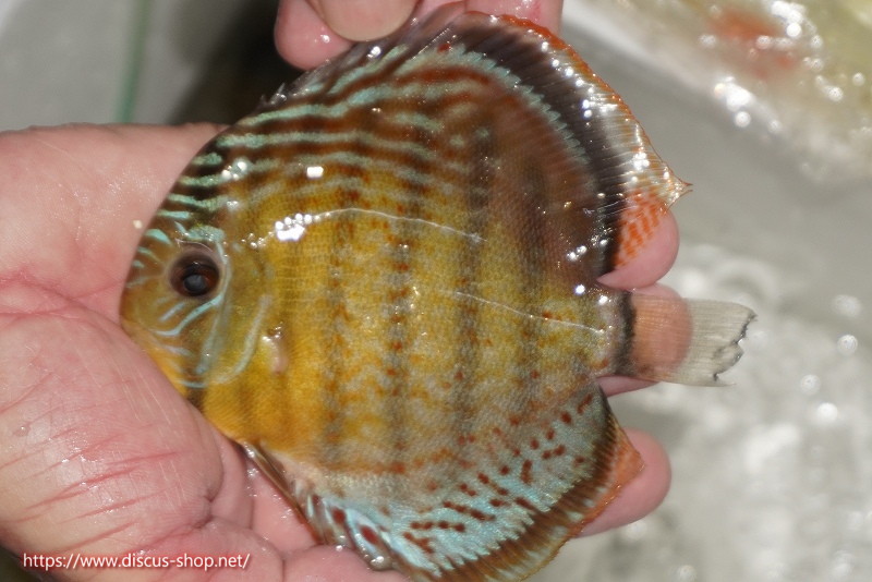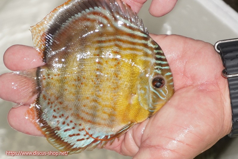 グリーンディスカスの中でも最もバリエーションが豊富でラージスポットタイプ、スポットラインタイプをはじめ、ロイヤルラインタイプなどの極上個体。またベースカラーの黄色、ホリゾンタルラインの青み、スポットの赤と最もカラフルな種となります。仕上がれば改良品種顔負けのど派手なパターンを持つ魅力的な産地の個体となります。