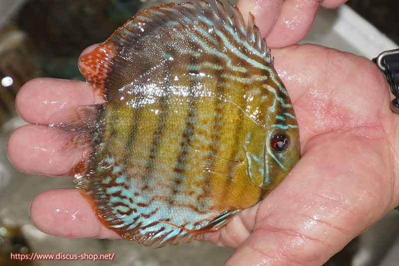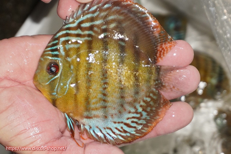 グリーンディスカスの中でも最もバリエーションが豊富でラージスポットタイプ、スポットラインタイプをはじめ、ロイヤルラインタイプなどの極上個体。またベースカラーの黄色、ホリゾンタルラインの青み、スポットの赤と最もカラフルな種となります。仕上がれば改良品種顔負けのど派手なパターンを持つ魅力的な産地の個体となります。