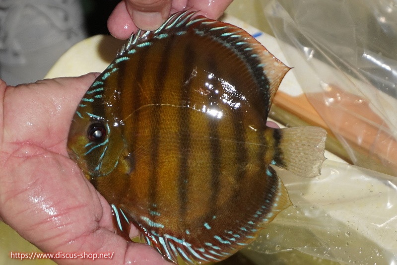 美しいラウンドフォルム、17センチを優に超える体躯でブルーディスカスの常識を覆した産地。下流域にはラインパターン、ソリッドが混生し、上流域には目を見張る様な青を発色するヘッケルが生息する。
