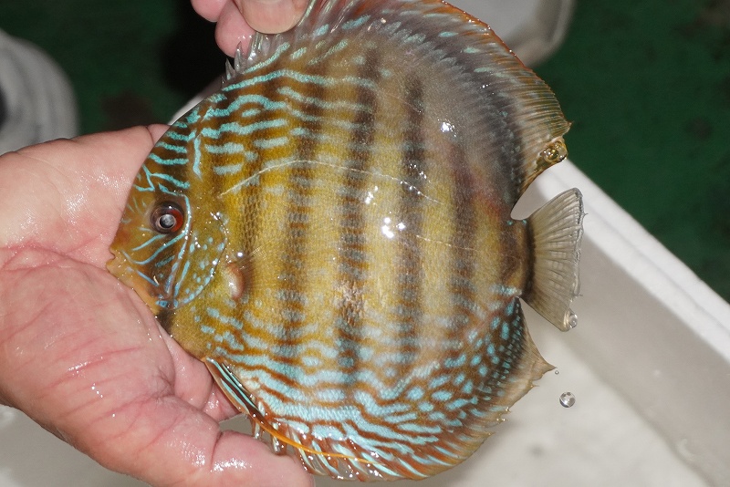 美しいラウンドフォルム、17センチを優に超える体躯でブルーディスカスの常識を覆した産地。下流域にはラインパターン、ソリッドが混生し、上流域には目を見張る様な青を発色するヘッケルが生息する。