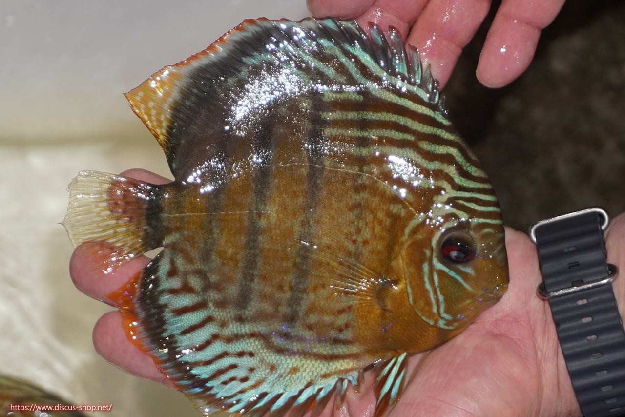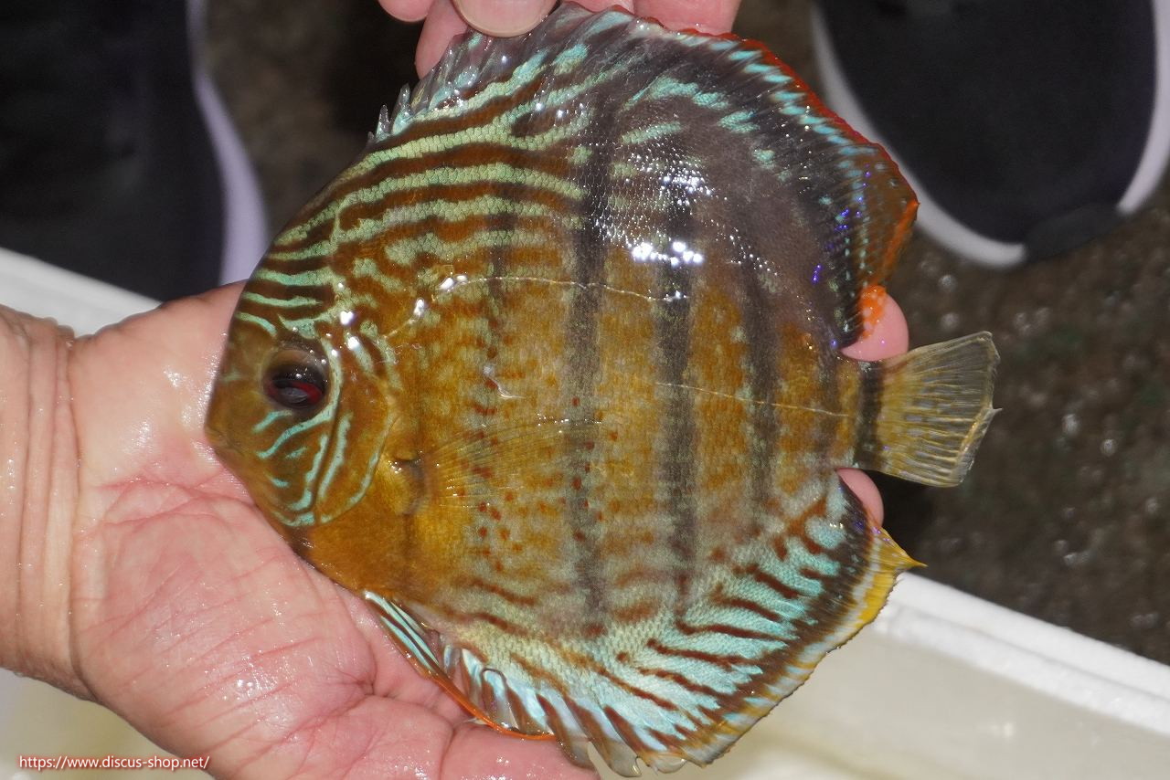グリーンディスカスの中でも最もバリエーションが豊富でラージスポットタイプ、スポットラインタイプをはじめ、ロイヤルラインタイプなどの極上個体。またベースカラーの黄色、ホリゾンタルラインの青み、スポットの赤と最もカラフルな種となります。仕上がれば改良品種顔負けのど派手なパターンを持つ魅力的な産地の個体となります。