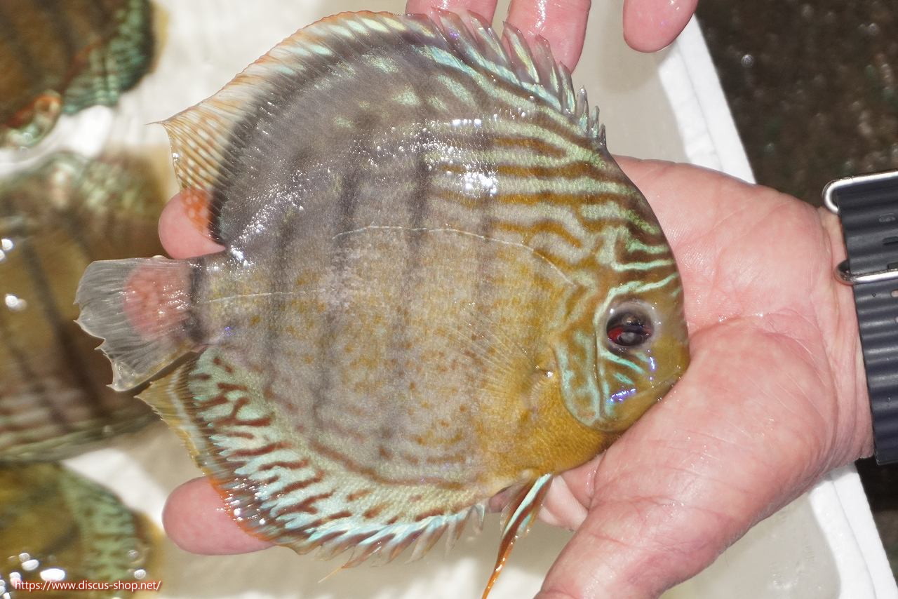 グリーンディスカスの中でも最もバリエーションが豊富でラージスポットタイプ、スポットラインタイプをはじめ、ロイヤルラインタイプなどの極上個体。またベースカラーの黄色、ホリゾンタルラインの青み、スポットの赤と最もカラフルな種となります。仕上がれば改良品種顔負けのど派手なパターンを持つ魅力的な産地の個体となります。