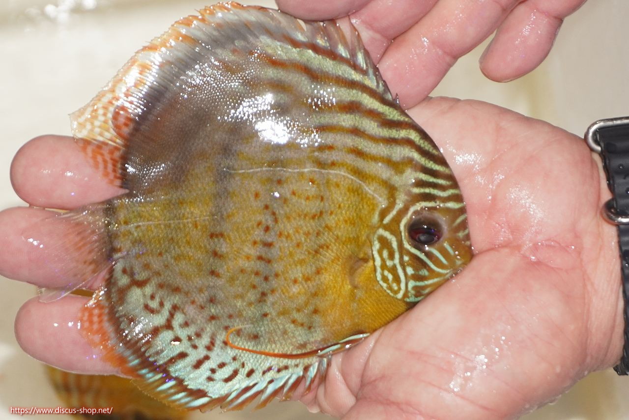 グリーンディスカスの中でも最もバリエーションが豊富でラージスポットタイプ、スポットラインタイプをはじめ、ロイヤルラインタイプなどの極上個体。またベースカラーの黄色、ホリゾンタルラインの青み、スポットの赤と最もカラフルな種となります。仕上がれば改良品種顔負けのど派手なパターンを持つ魅力的な産地の個体となります。