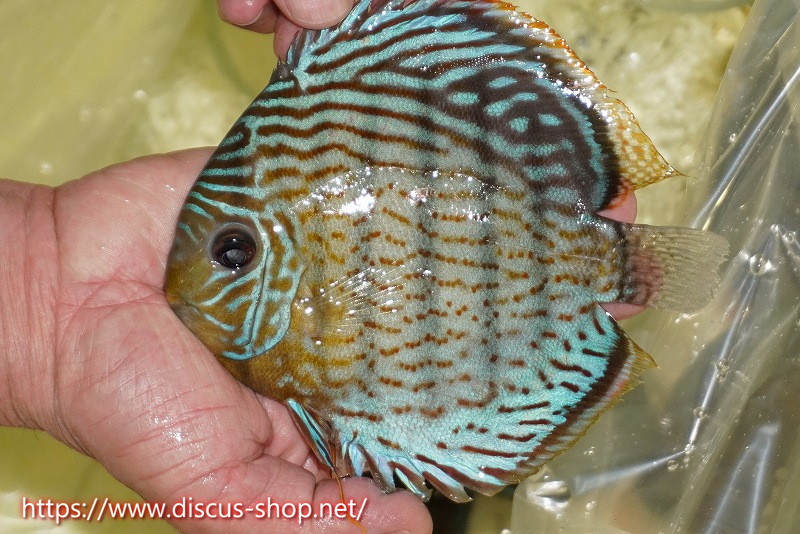 グリーンディスカスの中でも最もバリエーションが豊富でラージスポットタイプ、スポットラインタイプをはじめ、ロイヤルラインタイプなどの極上個体。またベースカラーの黄色、ホリゾンタルラインの青み、スポットの赤と最もカラフルな種となります。仕上がれば改良品種顔負けのど派手なパターンを持つ魅力的な産地の個体となります。