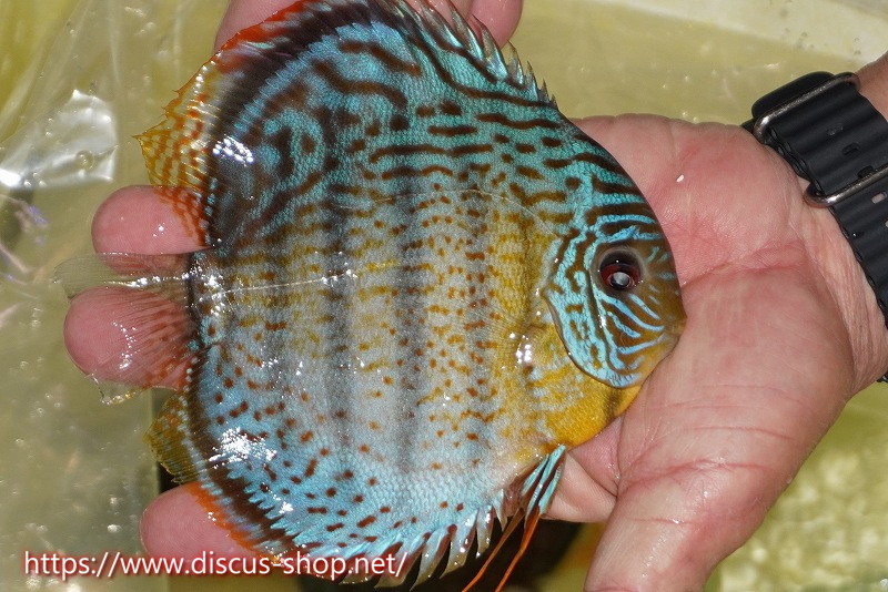 グリーンディスカスの中でも最もバリエーションが豊富でラージスポットタイプ、スポットラインタイプをはじめ、ロイヤルラインタイプなどの極上個体。またベースカラーの黄色、ホリゾンタルラインの青み、スポットの赤と最もカラフルな種となります。仕上がれば改良品種顔負けのど派手なパターンを持つ魅力的な産地の個体となります。