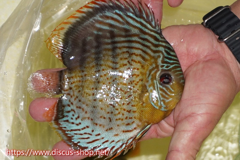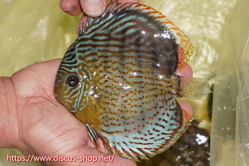 グリーンディスカスの中でも最もバリエーションが豊富でラージスポットタイプ、スポットラインタイプをはじめ、ロイヤルラインタイプなどの極上個体。またベースカラーの黄色、ホリゾンタルラインの青み、スポットの赤と最もカラフルな種となります。仕上がれば改良品種顔負けのど派手なパターンを持つ魅力的な産地の個体となります。