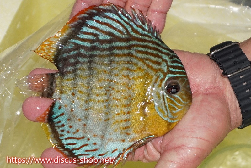 グリーンディスカスの中でも最もバリエーションが豊富でラージスポットタイプ、スポットラインタイプをはじめ、ロイヤルラインタイプなどの極上個体。またベースカラーの黄色、ホリゾンタルラインの青み、スポットの赤と最もカラフルな種となります。仕上がれば改良品種顔負けのど派手なパターンを持つ魅力的な産地の個体となります。