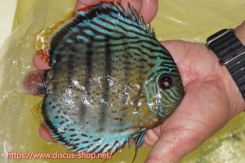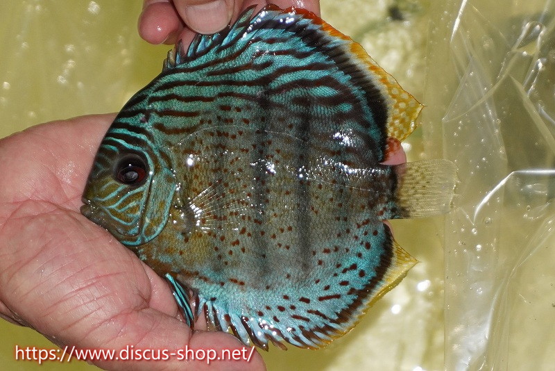 グリーンディスカスの中でも最もバリエーションが豊富でラージスポットタイプ、スポットラインタイプをはじめ、ロイヤルラインタイプなどの極上個体。またベースカラーの黄色、ホリゾンタルラインの青み、スポットの赤と最もカラフルな種となります。仕上がれば改良品種顔負けのど派手なパターンを持つ魅力的な産地の個体となります。
