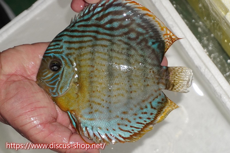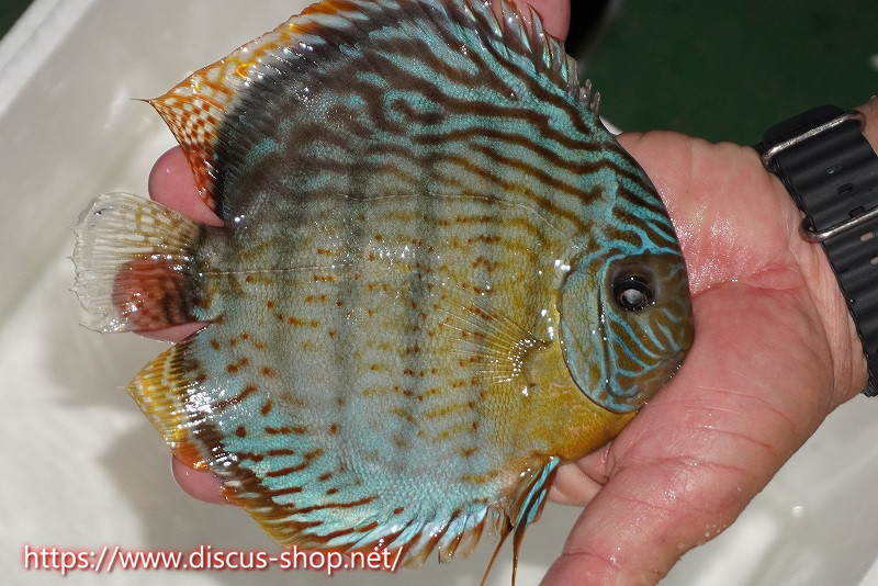 グリーンディスカスの中でも最もバリエーションが豊富でラージスポットタイプ、スポットラインタイプをはじめ、ロイヤルラインタイプなどの極上個体。またベースカラーの黄色、ホリゾンタルラインの青み、スポットの赤と最もカラフルな種となります。仕上がれば改良品種顔負けのど派手なパターンを持つ魅力的な産地の個体となります。