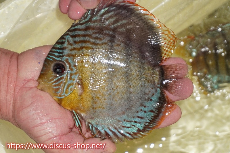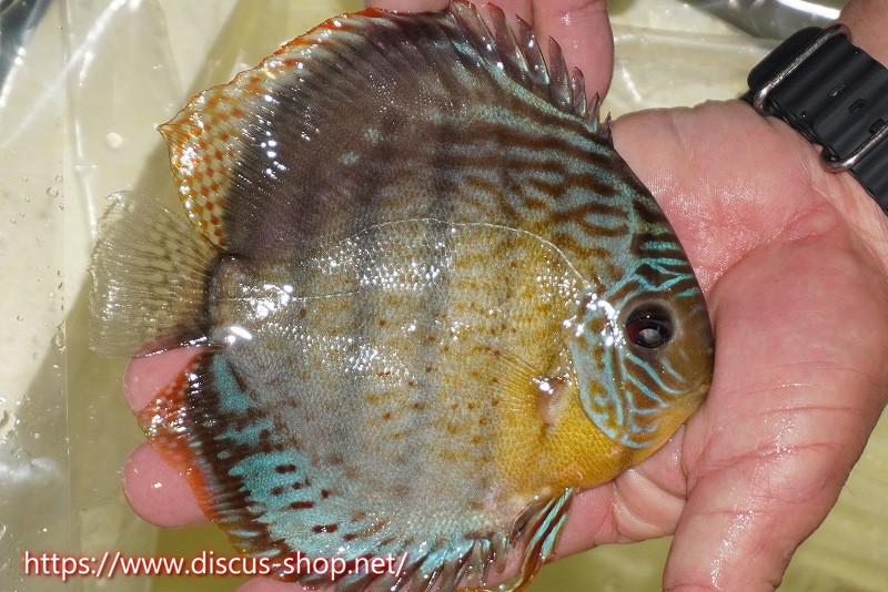 グリーンディスカスの中でも最もバリエーションが豊富でラージスポットタイプ、スポットラインタイプをはじめ、ロイヤルラインタイプなどの極上個体。またベースカラーの黄色、ホリゾンタルラインの青み、スポットの赤と最もカラフルな種となります。仕上がれば改良品種顔負けのど派手なパターンを持つ魅力的な産地の個体となります。