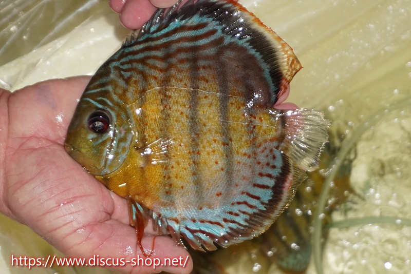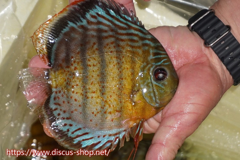 グリーンディスカスの中でも最もバリエーションが豊富でラージスポットタイプ、スポットラインタイプをはじめ、ロイヤルラインタイプなどの極上個体。またベースカラーの黄色、ホリゾンタルラインの青み、スポットの赤と最もカラフルな種となります。仕上がれば改良品種顔負けのど派手なパターンを持つ魅力的な産地の個体となります。
