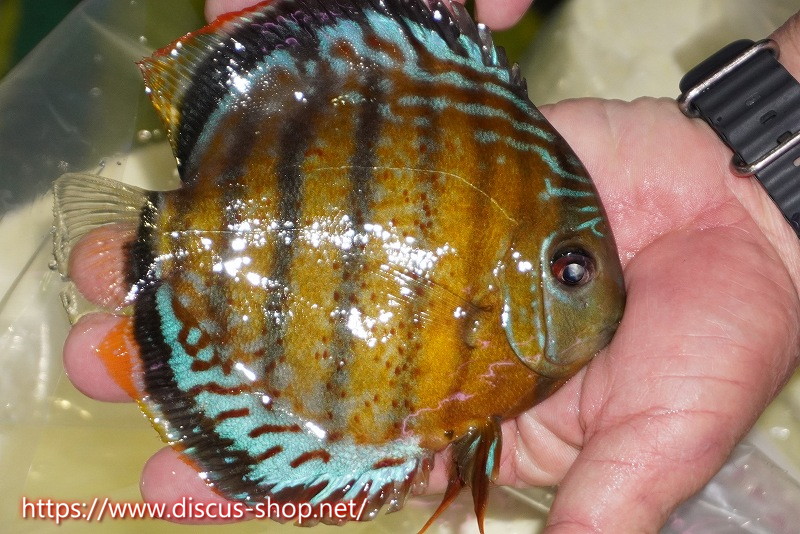 グリーンディスカスの中でも最もバリエーションが豊富でラージスポットタイプ、スポットラインタイプをはじめ、ロイヤルラインタイプなどの極上個体。またベースカラーの黄色、ホリゾンタルラインの青み、スポットの赤と最もカラフルな種となります。仕上がれば改良品種顔負けのど派手なパターンを持つ魅力的な産地の個体となります。