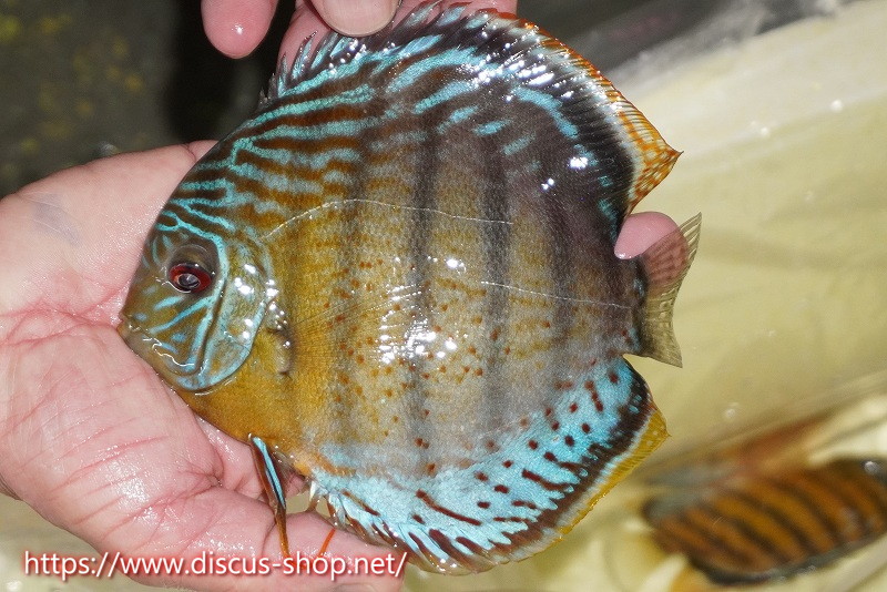 グリーンディスカスの中でも最もバリエーションが豊富でラージスポットタイプ、スポットラインタイプをはじめ、ロイヤルラインタイプなどの極上個体。またベースカラーの黄色、ホリゾンタルラインの青み、スポットの赤と最もカラフルな種となります。仕上がれば改良品種顔負けのど派手なパターンを持つ魅力的な産地の個体となります。