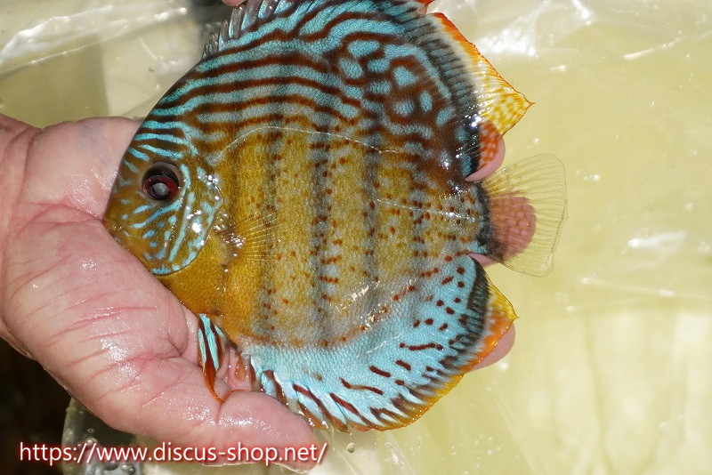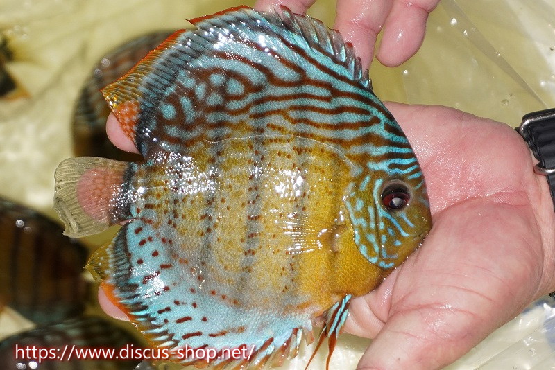 グリーンディスカスの中でも最もバリエーションが豊富でラージスポットタイプ、スポットラインタイプをはじめ、ロイヤルラインタイプなどの極上個体。またベースカラーの黄色、ホリゾンタルラインの青み、スポットの赤と最もカラフルな種となります。仕上がれば改良品種顔負けのど派手なパターンを持つ魅力的な産地の個体となります。