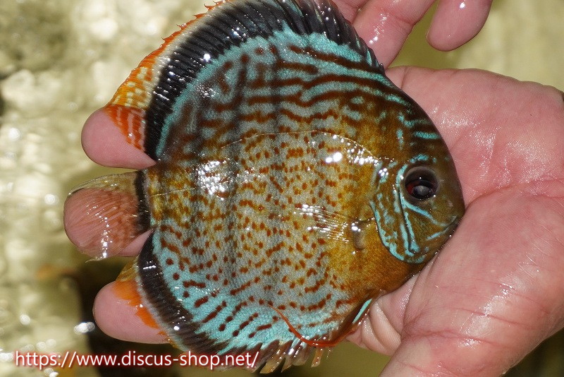 グリーンディスカスの中でも最もバリエーションが豊富でラージスポットタイプ、スポットラインタイプをはじめ、ロイヤルラインタイプなどの極上個体。またベースカラーの黄色、ホリゾンタルラインの青み、スポットの赤と最もカラフルな種となります。仕上がれば改良品種顔負けのど派手なパターンを持つ魅力的な産地の個体となります。