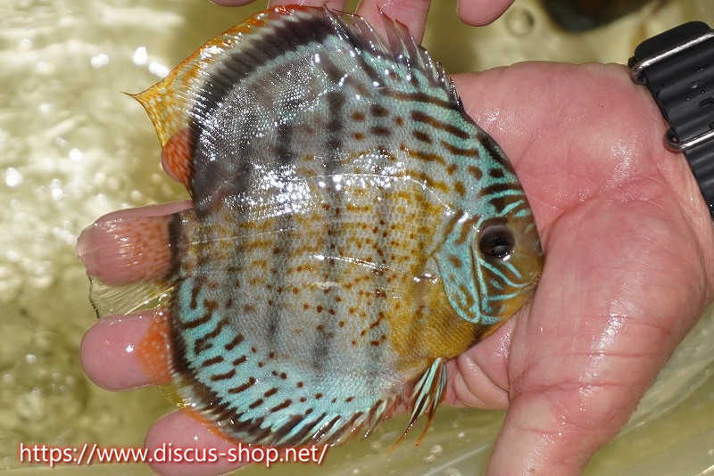 グリーンディスカスの中でも最もバリエーションが豊富でラージスポットタイプ、スポットラインタイプをはじめ、ロイヤルラインタイプなどの極上個体。またベースカラーの黄色、ホリゾンタルラインの青み、スポットの赤と最もカラフルな種となります。仕上がれば改良品種顔負けのど派手なパターンを持つ魅力的な産地の個体となります。