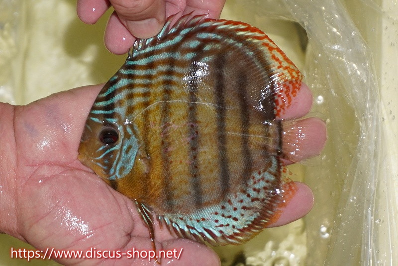グリーンディスカスの中でも最もバリエーションが豊富でラージスポットタイプ、スポットラインタイプをはじめ、ロイヤルラインタイプなどの極上個体。またベースカラーの黄色、ホリゾンタルラインの青み、スポットの赤と最もカラフルな種となります。仕上がれば改良品種顔負けのど派手なパターンを持つ魅力的な産地の個体となります。
