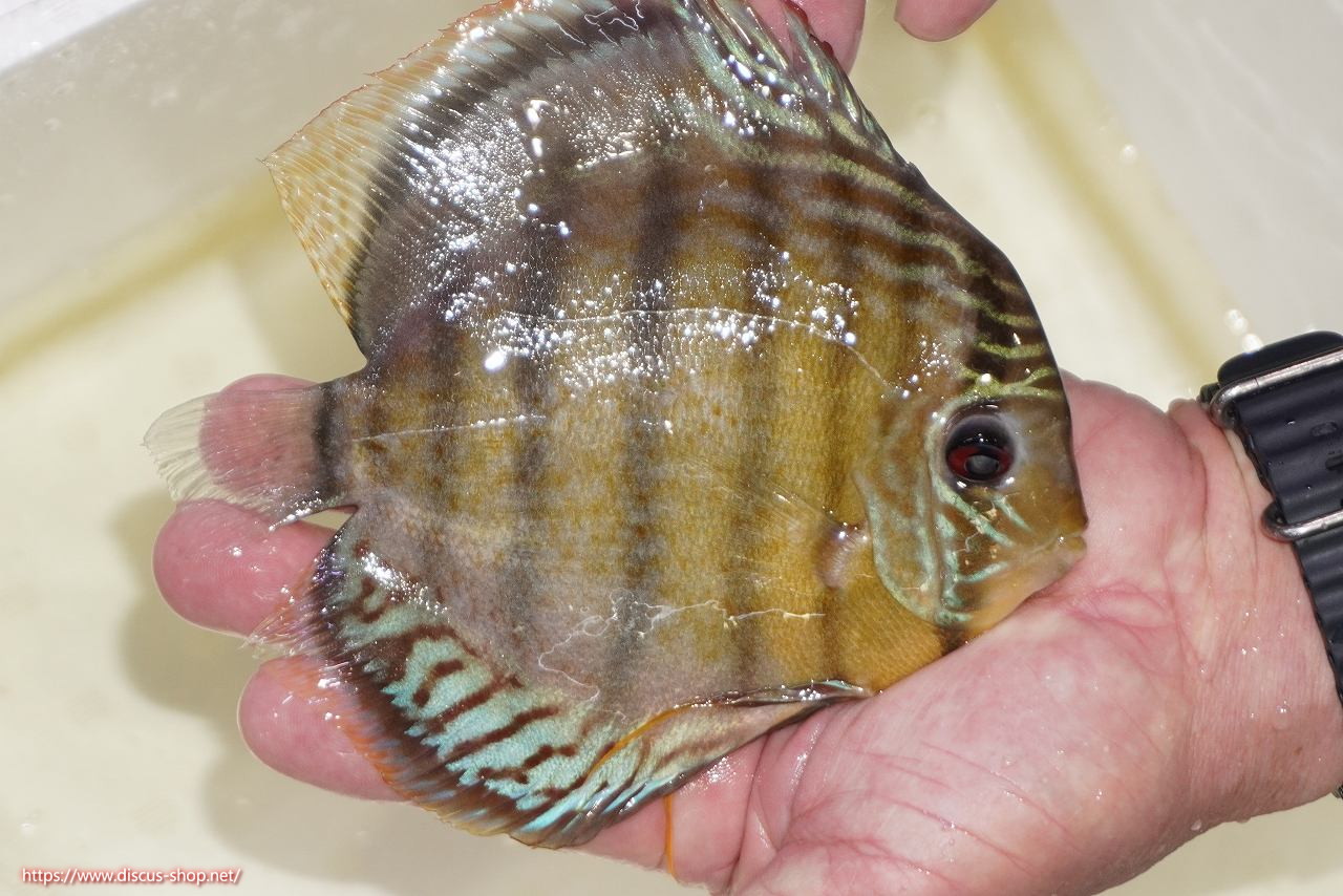 グリーンディスカスの中でも最もバリエーションが豊富でラージスポットタイプ、スポットラインタイプをはじめ、ロイヤルラインタイプなどの極上個体。またベースカラーの黄色、ホリゾンタルラインの青み、スポットの赤と最もカラフルな種となります。仕上がれば改良品種顔負けのど派手なパターンを持つ魅力的な産地の個体となります。