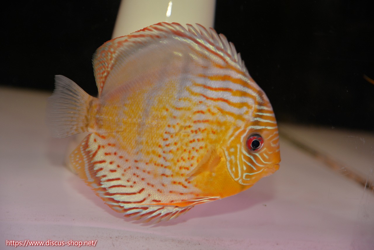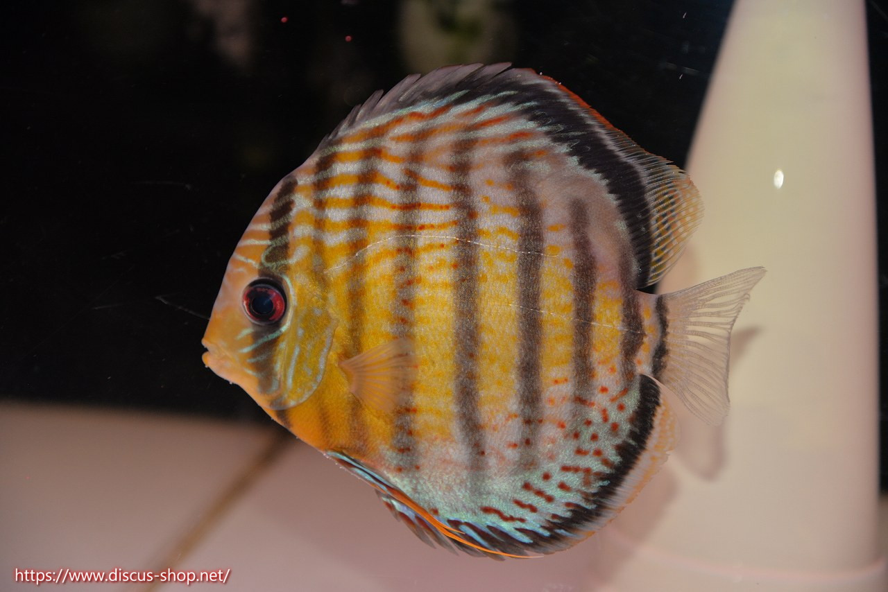グリーンディスカスの中でも最もバリエーションが豊富でラージスポットタイプ、スポットラインタイプをはじめ、ロイヤルラインタイプなどの極上個体。またベースカラーの黄色、ホリゾンタルラインの青み、スポットの赤と最もカラフルな種となります。仕上がれば改良品種顔負けのど派手なパターンを持つ魅力的な産地の個体となります。